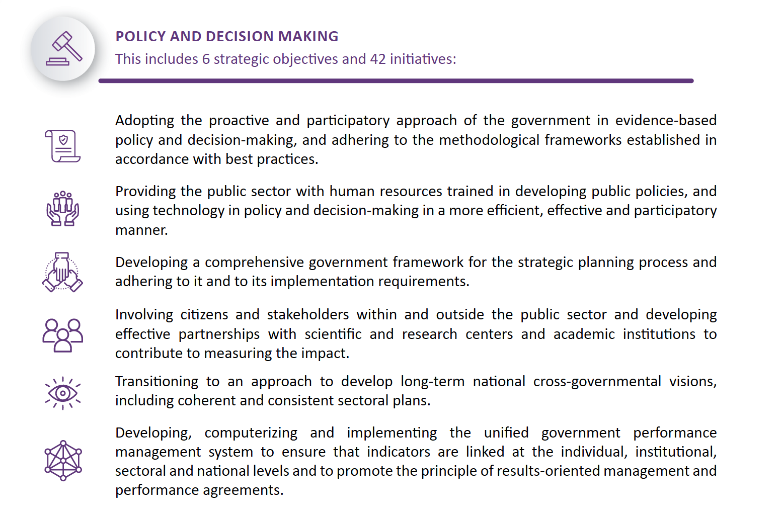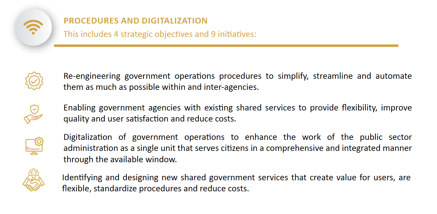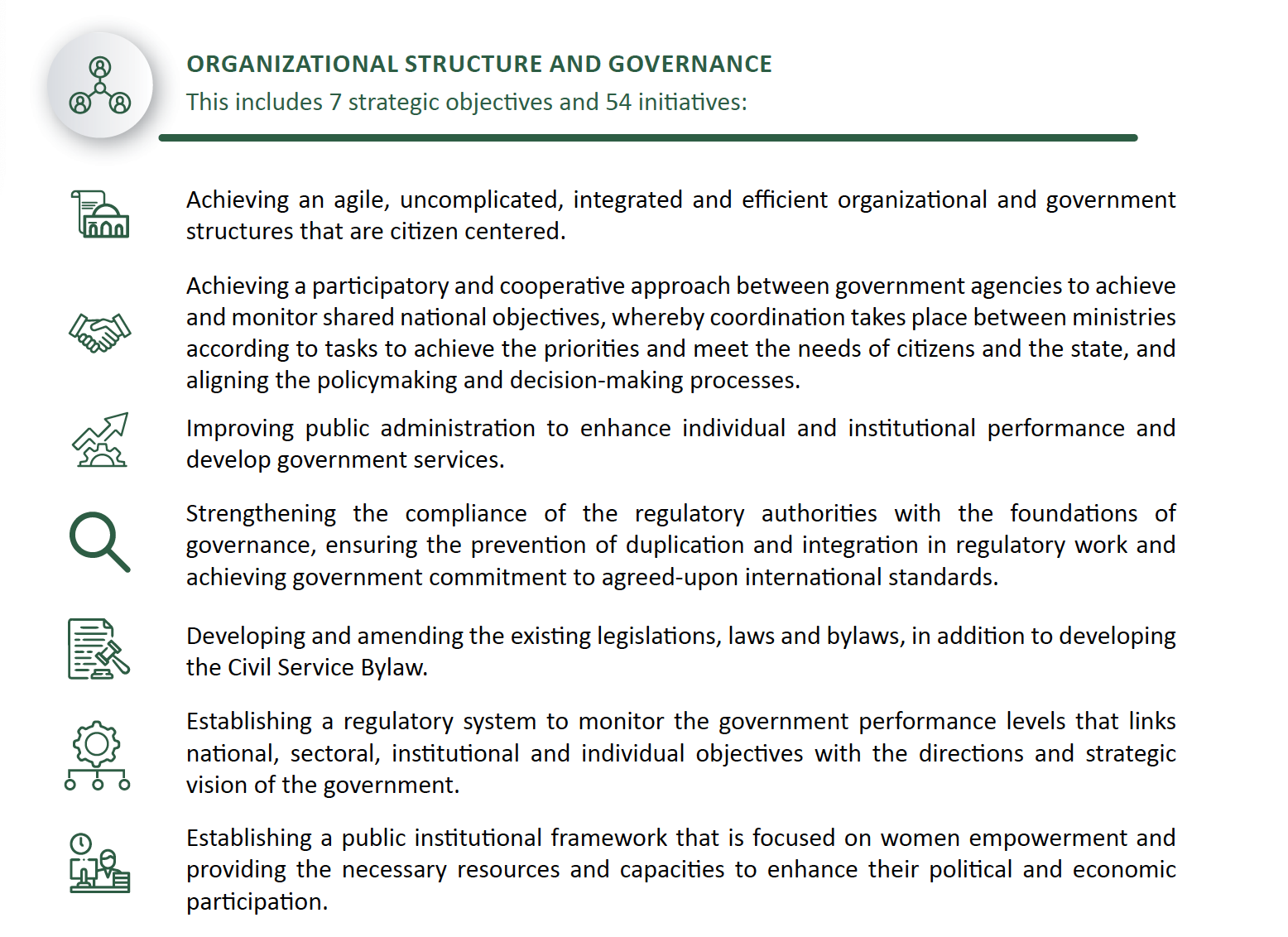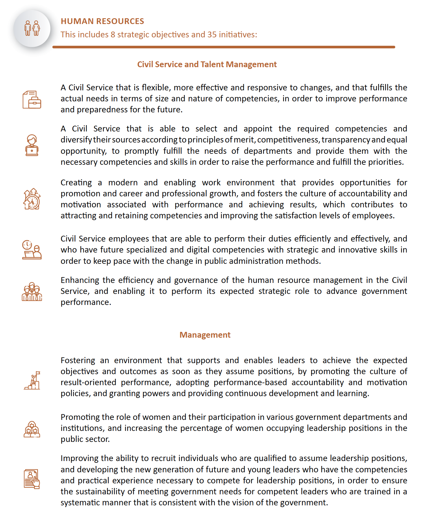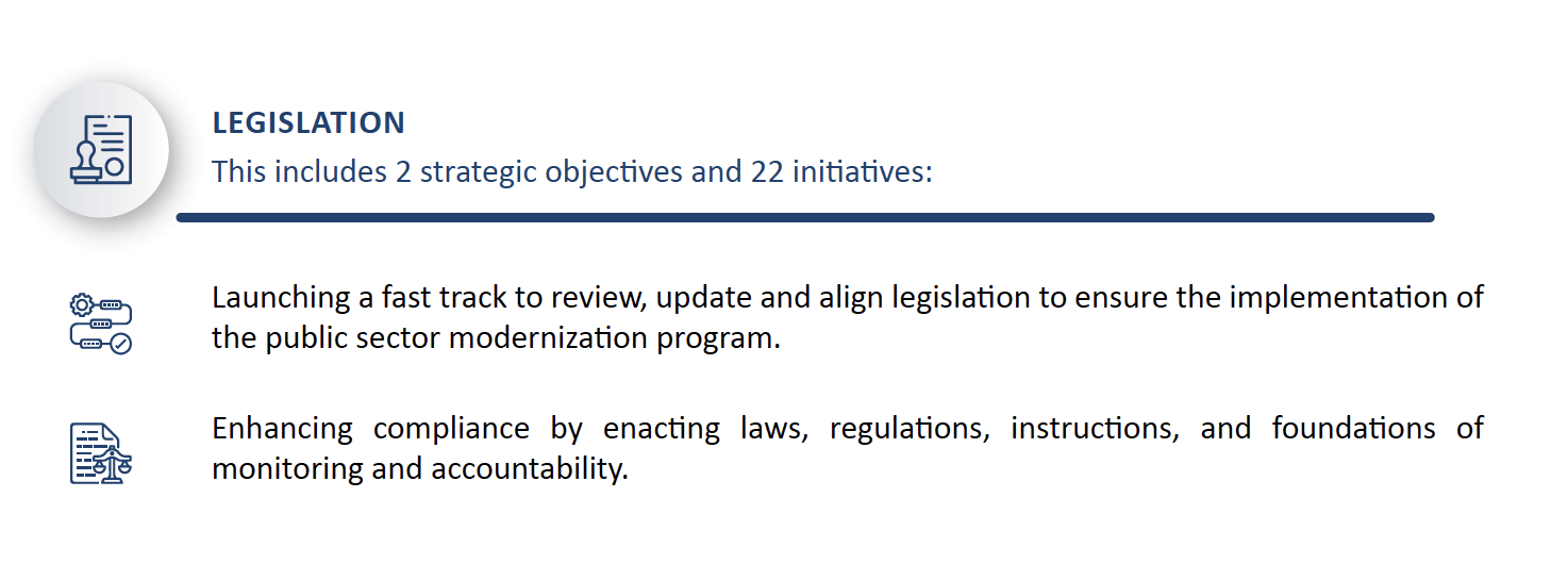 The Public Sector Modernization Vision seeks to achieve 33 strategic objectives which constitute the roadmap for modernizing the public sector for the next ten years, and they fall under the seven components of the modernization framework. The executive program for modernizing the Public Sector 2022 – 2025 included 206 procedures and initiatives that will be implemented in the first phase of the roadmap. Moreover, a comprehensive evaluation of the program will be conducted, and the achievements and lessons learned from the initiatives will be monitored, in order to develop the second phase of the program for the years (2026-2029), followed by a comprehensive assessment of the second phase of the program at the end of 2029 in order to design a third phase and identifying the suitable initiatives for the period 2030-2033.