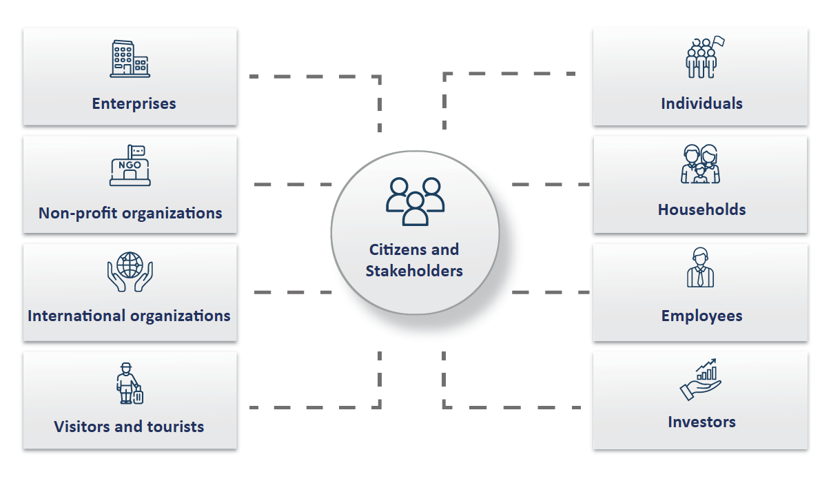 in addition to making available the policies and information that enable them to be real partners in government decision-making and implementation tracking, and communicating when conducting change to measure their impressions and satisfaction with the level of service provision. In this program, when there is a reference to citizens and stakeholders, it would refer to individuals, households, employees, investors, enterprises, non-profit organizations, international organizations, and visitors and tourists.